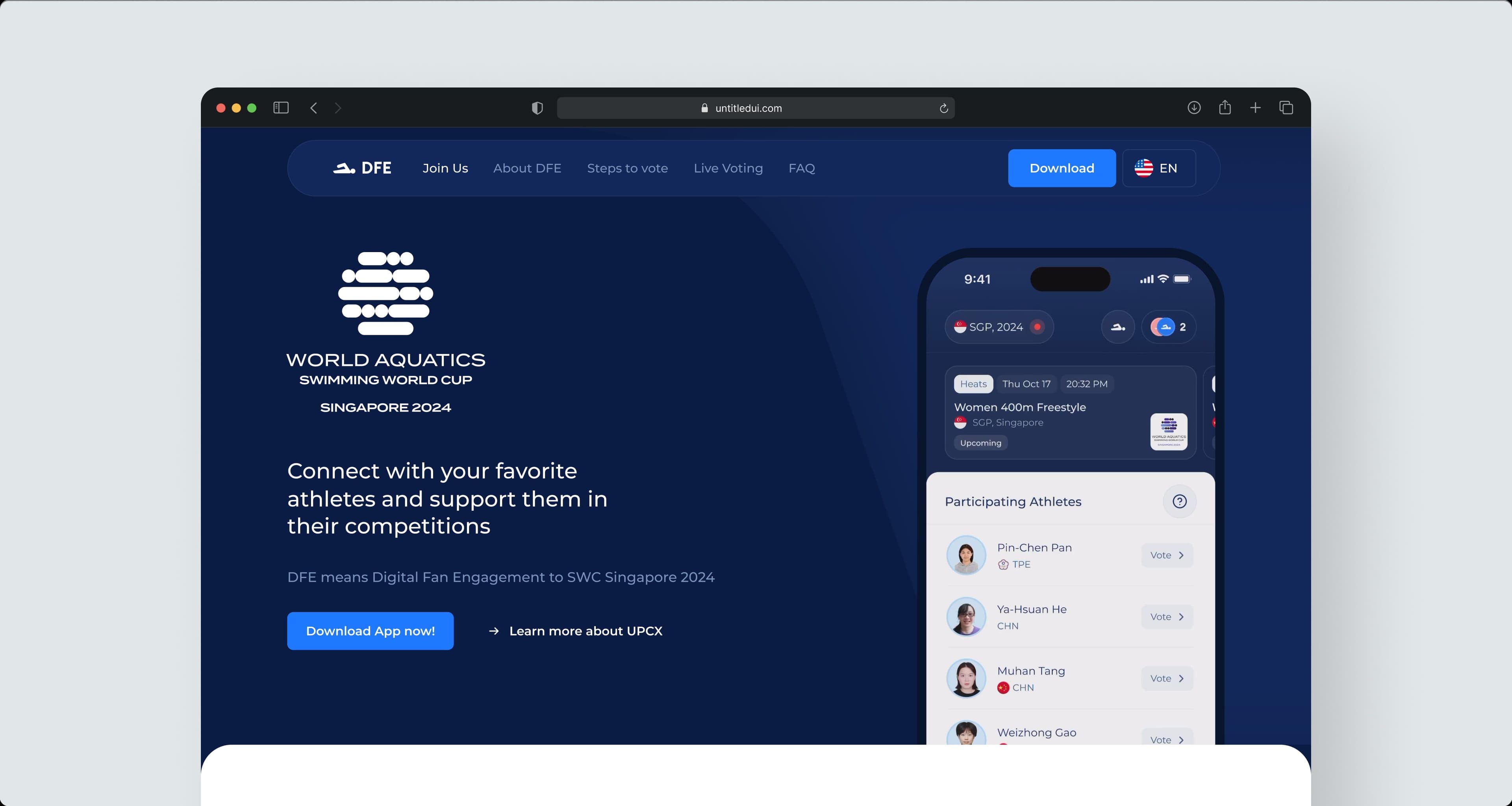 The **Digital Fan Engagement (DFE) **application is a blockchain-based mobile platform created to empower water sports fans, allowing them to vote securely and transparently during international competitions. Developed in collaboration with Motivo, the app connects global audiences directly with athletes and events, enhancing real-time interaction and fostering community loyalty through a decentralized ecosystem that revolutionizes how fans participate in aquatic sports