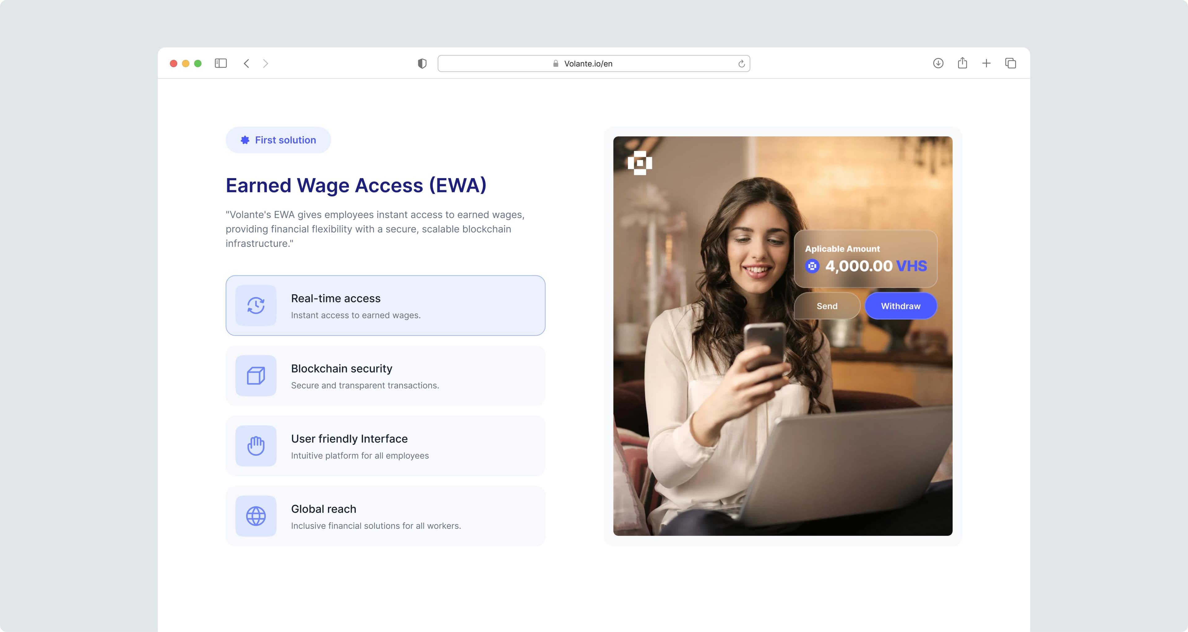 Volante is a platform that integrates blockchain and artificial intelligence, offering early access to salaries and financial solutions for vulnerable communities. At Motivo, we developed the business strategy and conducted detailed market research. We created the website, whitepaper, and sales deck, which enabled the attraction of investors and the establishment of strategic partnerships for large-scale launch